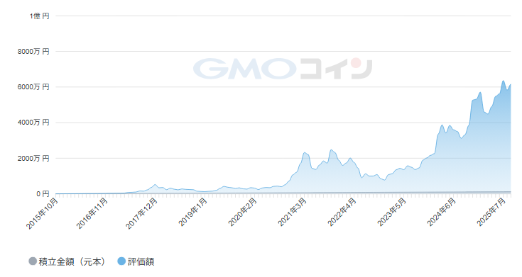 実際、2015年から2025年のビットコインの積立投資の実績では、月1万円の投資で元本120万円が約6,100万円になったという結果も出ています。