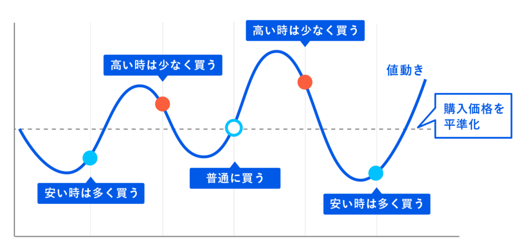 毎月一定額を購入することでタイミングを分散し、相場が低い時は多く、高い時は少なく買うため、長期的に見れば購入価格が平準化されます。