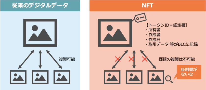 従来のデジタルデータとの違いは、ブロックチェーン上に記録されている点にあります。